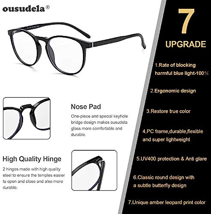 【Blue Light Filter】Ousudela blue light glasses help to filter blue light to reduce eye fatigue, eye strain, blurred vision and headache. Also, improving sleep quality.