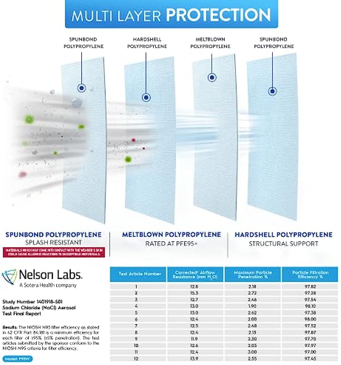 • Superior Protection & Breathability - BNX’s multi-layer filtration technology provides maximum protection, comfort and breathability. The active filter layer of these N95 masks is composed of ultra-high grade electrostatically charged meltblown polypropylene. Extremely breathable up to 50%+ more breathable than NIOSH minimum requirement.