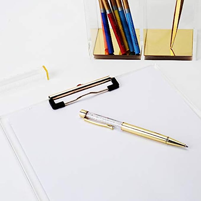 • Clear acrylic with gold design style will make a unique and stylish addition to your workplace. Enjoy the simplicity of these clipboards alone, or coordinate with our other acrylic desk accessories