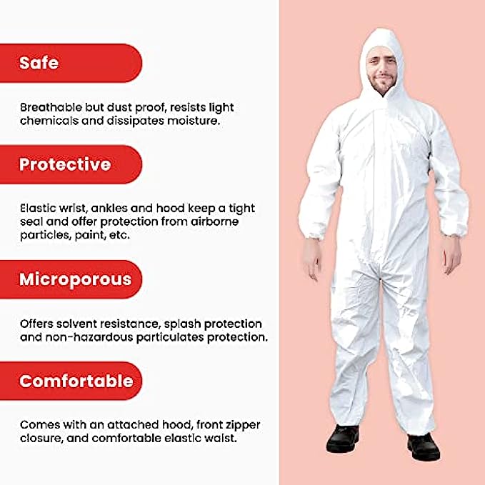• COMFORTABLE: These coveralls come with an attached hood and a front zipper closure. They are breathable, comfortable, dust proof, light chemical resistant and designed to allow for moisture to dissipate.