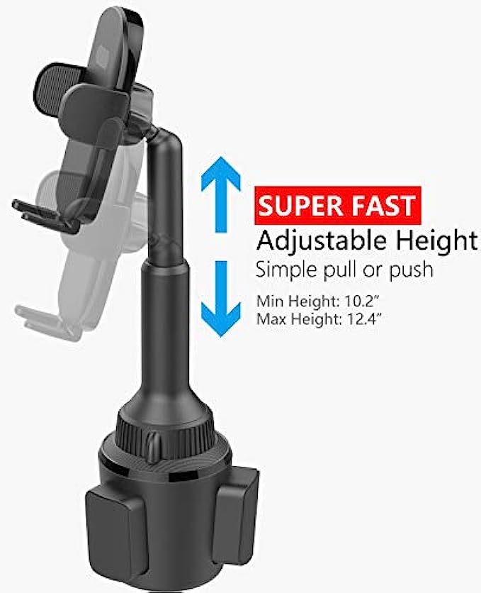 • Quick Extension Sturdy Arm: No more screws adjusting, just pull and push to adjust the height. Easy one-hand operation! The car cup holder phone mount can reach a maximum height of 12.4" for easy operating and access to your device without blocking anything on the console.
