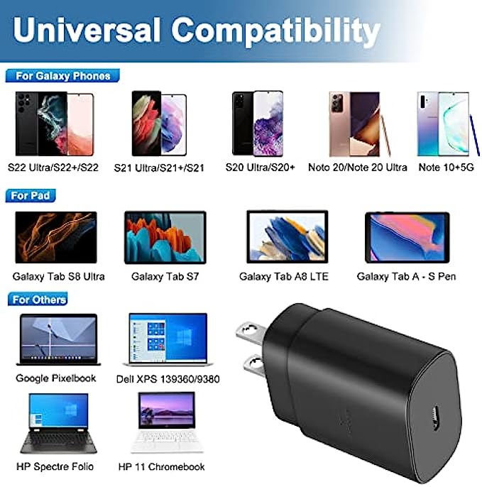 25W Samsung Super Fast Charger: Equipped with an USB Type C port, the Power Delivery 3.0 USB C wall charger provides you Max 25W output power. You can charge your deivce back to full power in no time by using the 25W USB C charger for Samsung galaxy S22, S22 Ultra, S22+, S22 Plus, z fold3 5G, z flip 3, S21, S21 Ultra, S21 Plus, Note 10 and more. You can charge your Phone to 60% in just half an hour, 5 times as fast as standard USB C wall charger. 10FT C Charger Cable Fast Charging: The 25W super fast type c charger is equipped with extra longer 10FT Type C to C cable, offering a user-friendly reversible design and longer charging distance, fast charging and up to 480 Mbps data transfer speed. The power output up to 3 Amp and 100-240 volt input of this 2pack Samsung super fast chargers can charge two devices simultaneously, ideal for worldwide travel with your partner! Super Fast Charger Universal Compatibility: The Samsung S22 Ultra fast charger kit supports most of USB C devices, including Samsung Galaxy S21/ S21+/ S21 Ultra 5G/ S22/S22+/S22 Ultra/Note10/ 10+, Note 20/20 Ultra 5G, S20/S20+/S20 Ultra 5G/ S20 FE(Fan Edition) 5G, S10, S10+, Galaxy Z fold 3/ Galaxy Z Flip 3,S10e, S9, S9+ Plus, S8, S8+ Plus/Active, Google Pixel, Pixel 2, Pixel 3, Pixel XL, Pixel 2XL, Pixel 3XL, Pixel 3A, LG G7 Thing, G6, G5, V20, V30, V35, V30S, V40 ThinQ Plus, etc. Safety Assurance: The Samsung galaxy S22 super fast charger is built in intelligent chips, which can protect your devices against damage caused by short circuit, over-current, over-voltage, over-heating, and over-charging issues. Automatically stops charging when battery capacity is full to ensure your device safety and longevity. What You Get: 2-PACK 25W super fast chargers and 2-PACK 10FT Type C to C cables. 24*7 friendly customer support ensures your pleasing shopping experience. If there is any problem, please do not hesitate to contact us!