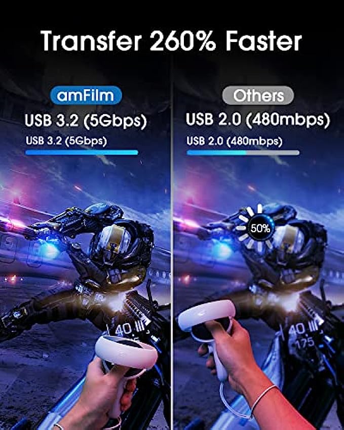 • High-Speed Data Transfer: Oculus Quest 2/1 link cable provides up to 5Gb per second transfer speed. The smart chip's quick and stable data synchronization and continuous current bring you the highest rendering quality of your PC and a smooth gaming experience. An additional USB-A port enables compatibility with older PCs as well.