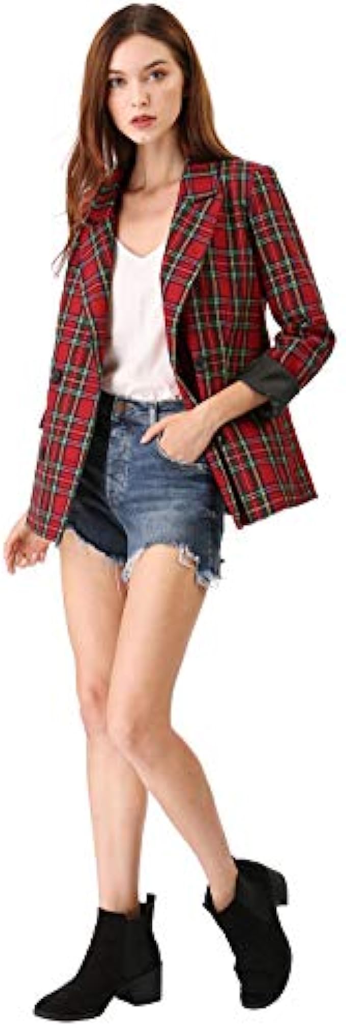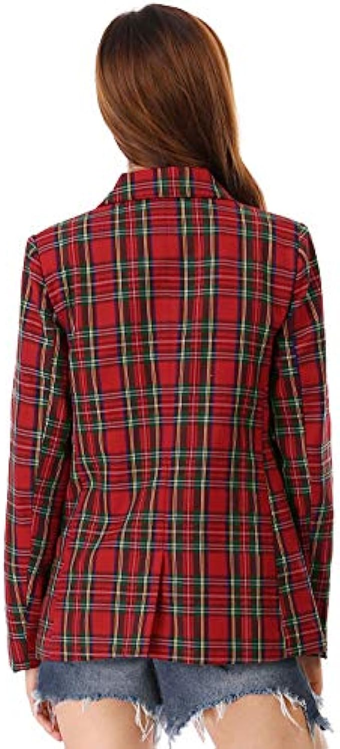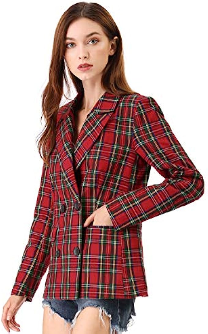 Allegra K Women's Notched Lapel Double Breasted Plaid Work Formal Blazer Jacket