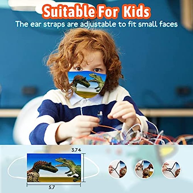 • 【3 Protective Layers】- Our dinosaurs disposable kids face mask is sized at 5.9inches x 3.9inches with 3 Ply layers , The Outer color layer is a water-resistant layer, say goodbye to splashing liquid; Middle layer is a filtering layer, say bye to particles from 0.3 to 1.0 pm. Inner layer is a water absorbing layer, which can absorb the moisture from the breath of the wearer, avoid the filtering layer from getting wet.