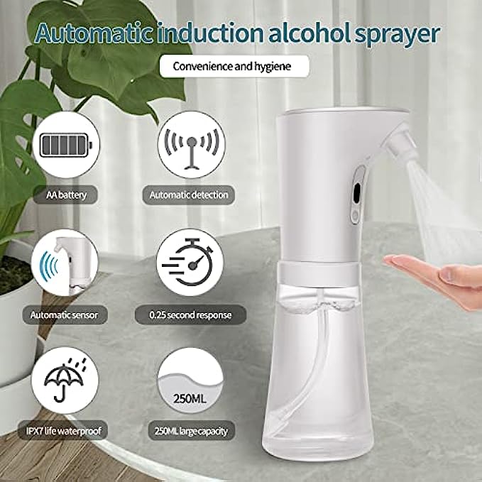 • Alcohol Disinfection--Disinfection/sterilization/sterilization alcohol dispenser using spray. Our alcohol dispenser can kill more than 99% of viruses and bacteria. The large capacity of 250ml can be used for a long time without worrying about frequent replenishment