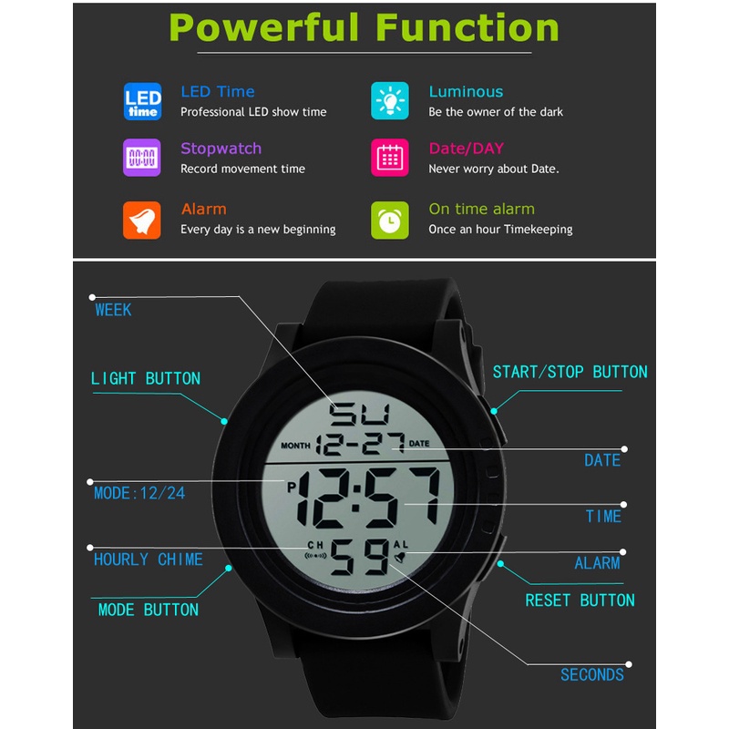 Men Watch Men's Watch Student Large Dial Silicone Sports Multi-Function Cold Light Waterproof Electronic Watch