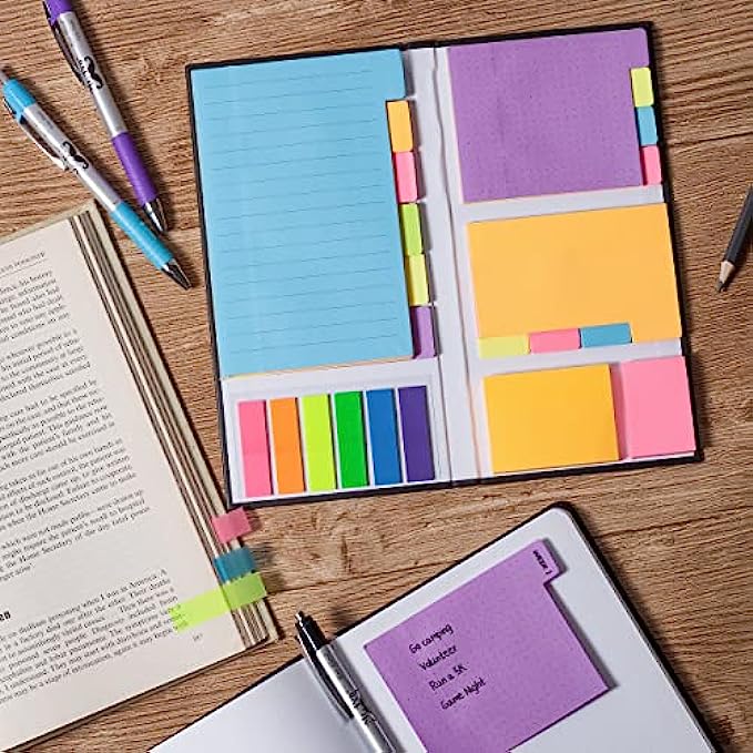 Each sticky notes set includes 60 Ruled (3.8x6’’), 40 Dotted Notes (3x3.8’’), 40 Blank (2.6x3.5’’), 60 Orange and Pink, 150 Neon Color Index Tabs, 410 Total Tab Divider Notes
