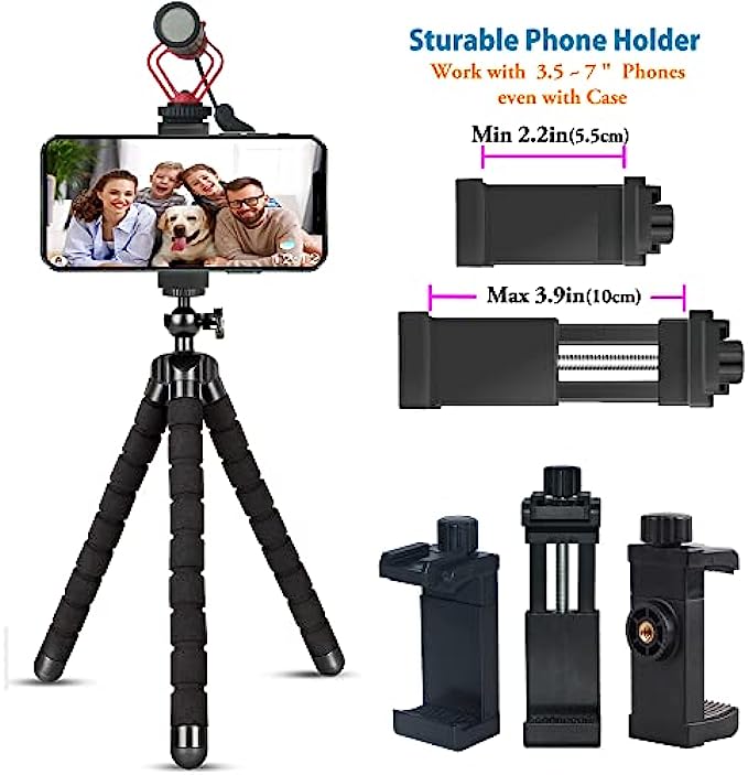 • 【Upgrated Phone Holder】cell phone tripod holder designed durable constuction, useing a screw stem to open and lock, not a spring clamp that is easily damaged. Cold shoe mount can connect LED light and microphone, for brilliant video recording and vlogging. compatible with 3.5 to 7 inch smartphone