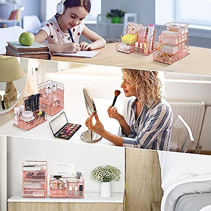 【All IN ONE MULTIFUNCTIONAL DESIGN】This versatile desk organizer set feature 1 square desk storage caddy and 1 3-Drawer Vertical organizer. Compartments are in various size and shape are not only perfect for storaging file,notebook,pens,scissors,tapes,stapler,paper clips,eraser and other your small office desk accessories,it's also the best choice for organizing your brushes,moisturizer,sunscreen,lipstick and other cosmetics in your dresser.