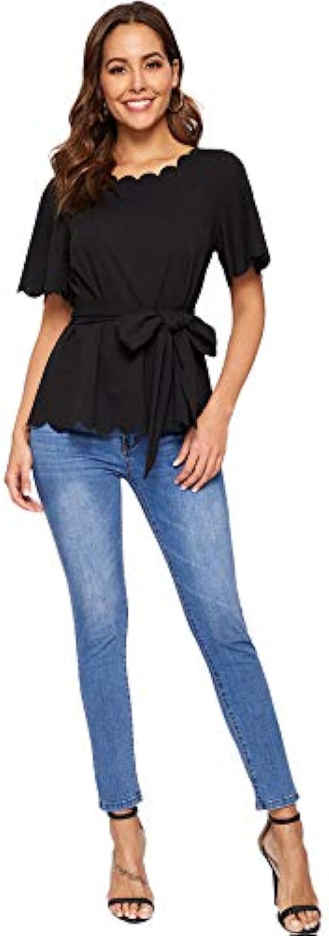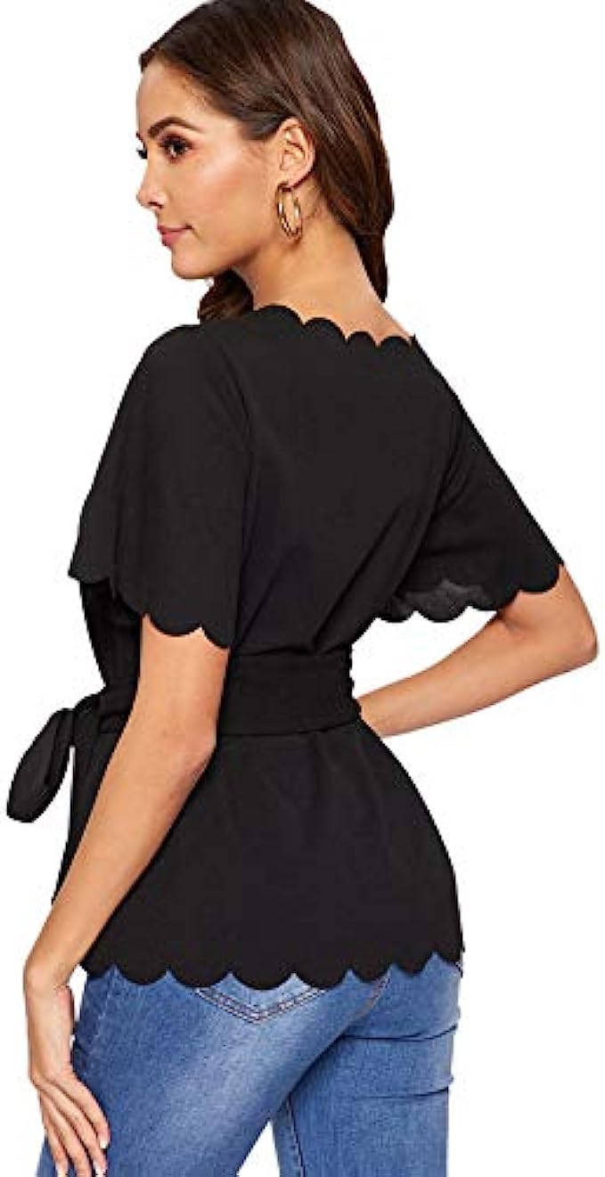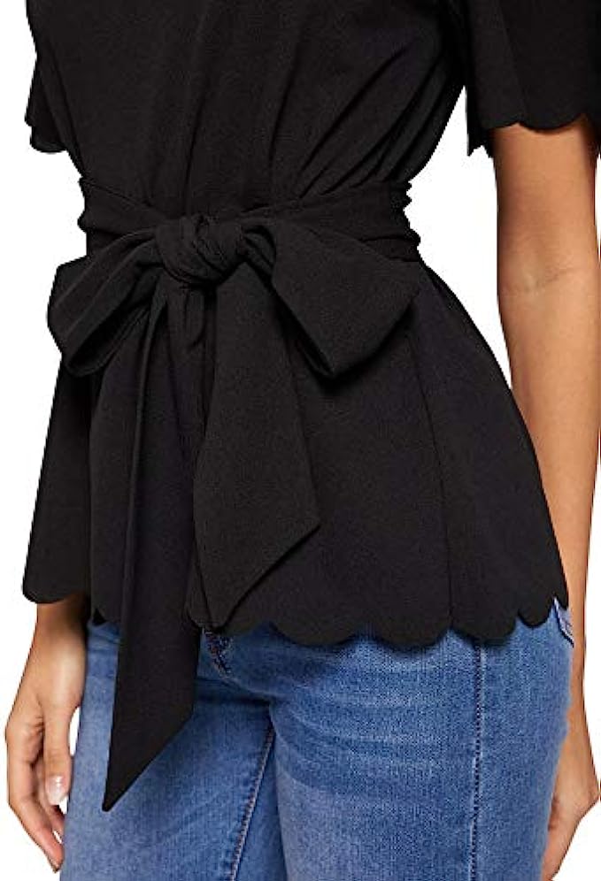 Romwe Women's Bow Self Tie Scalloped Cut Out Short Sleeve Elegant Office Work Tunic Blouse Top