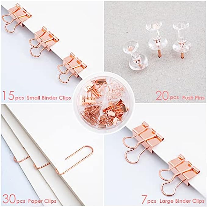 FREE BONUS WITH OFFICE ACCESSORIES SET: Cute desk organizer with bonus 72 desk accessories (7 Large Binders + 15 Small Binders + 20 Pushpins + 30 Paper Clips), stored in a reusable clear acrylic box, making these clips easy to access and organize. These clips help keep your files organized.