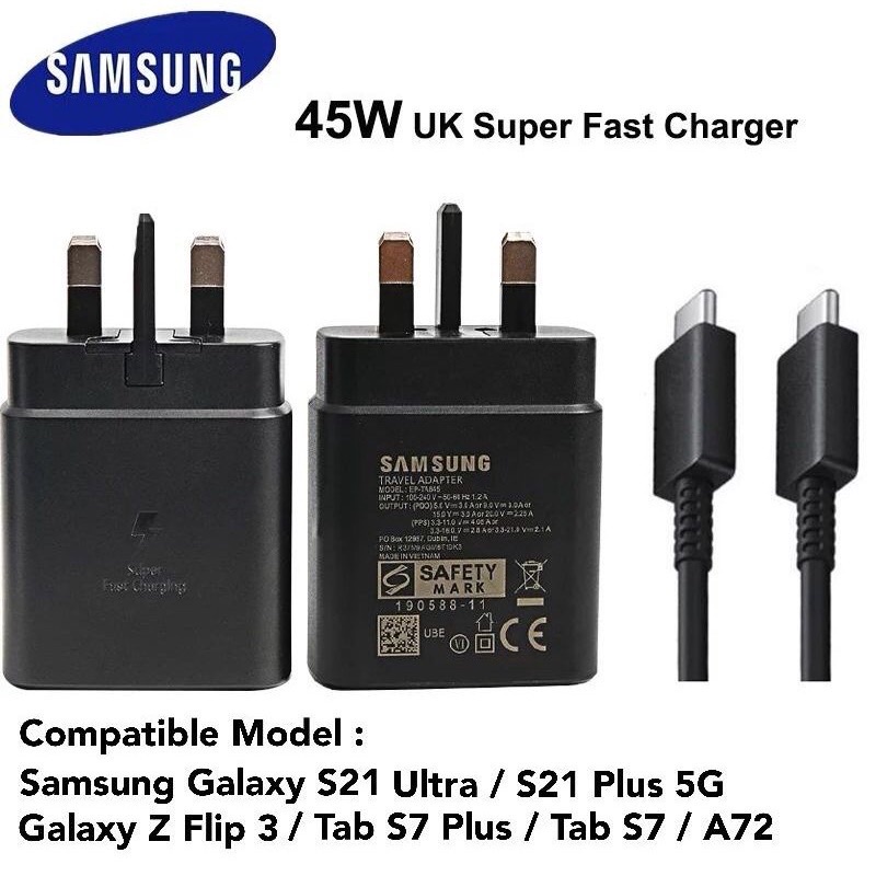 Samsung Fast Charger 45W UK Plug Super Fast PD Type C To Type C Cable For Galaxy S21 ultra S20 A72 A71 A91 Note10 Note20 Z Flip 3 Tab 7 Plus USB-C adapter