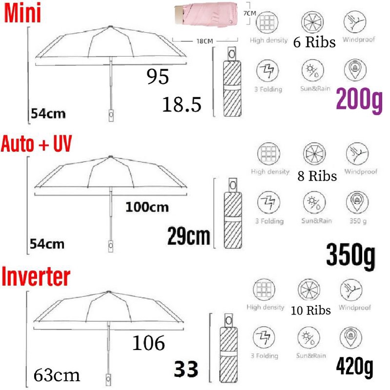Umbrella Mini Pocket Automatic UV Inverted Reverse Lightweight Portable Foldable UPF big large