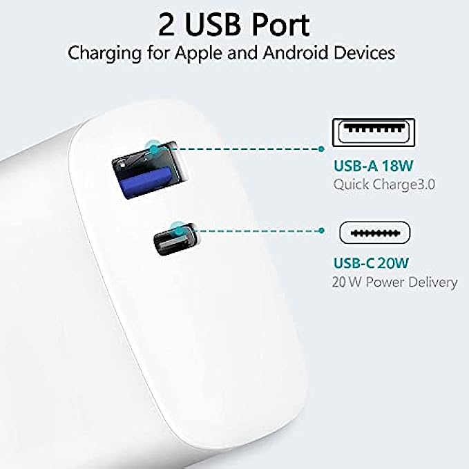 • [Dual-port charger] Deegotech USB C charger with 2 fast charging ports, a 20W PD3.0 USB-C port and an 18W 3A USB-A charging port, which supports fast charging for most mobile devices