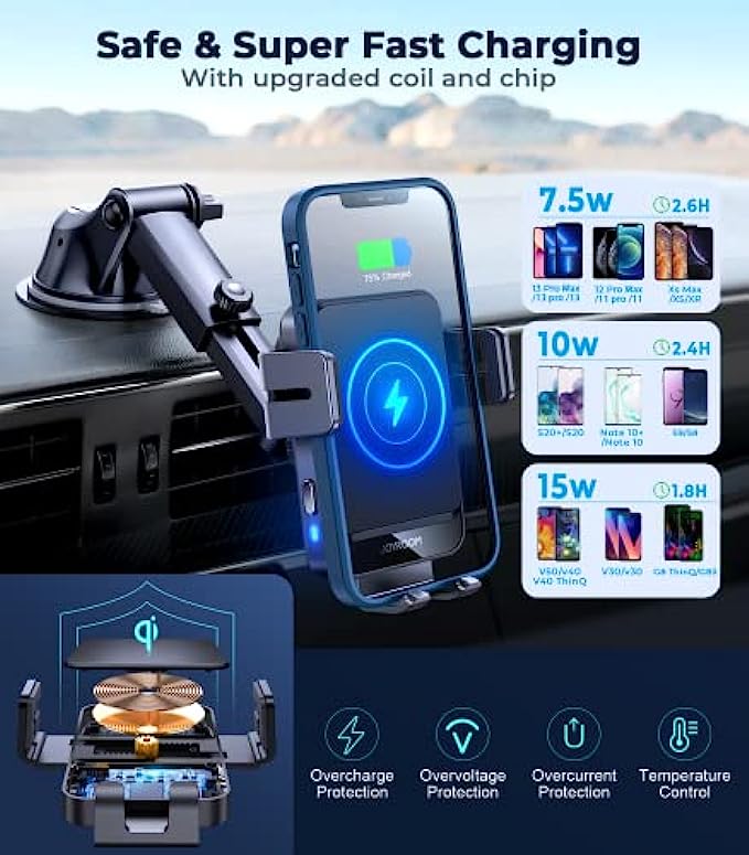 • ? 【Auto-Sensing & Smart Charging】 After connecting to the cable, Joyroom car phone holder mount wireless charging will automatically clamp when your phone is dropped in. A gentle touch on the 2 sides button of the car charger can make the arms open, which makes your driving easier and safer. When your phone is fully charged, the wireless charging car mount will automatically power off to protect the battery of your phone.