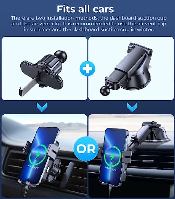 • ? 【Super Stable Base】Joyroom phone mount for car wireless charger's base is equipped with a powerful suction cup and professional 3M adhesive (high temperature resistant). The base's suction cup has been tested thousands of times, it can absorb more than 20 pounds of objects without dropping. Even if passing speed bumps or driving on mountain roads, you don’t need to worry about it falling. In addition, the bracket arm and clip are equipped with silicone pads for anti-slip and anti-vibration.