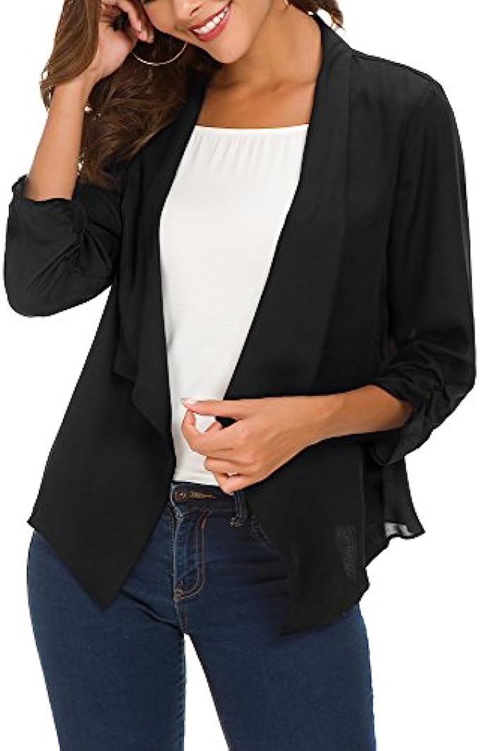 100% Polyester Imported Soft and lightweight fabric which is breathable and comfy and excellent in workmanship,make you feel comfortable for all-day Features 3/4 ruched sleeve blazer, open front, no padded shoulder,uneven vented hem,and notched collar Easy to match clothes,it's super easy to turn any outfit into a classy corporate wear when you have this lightweight chiffon blazer in your closet Great for casual, formal, business wear and other special events. Whether for a casual or a professional look, this blazer jacket makes you cool
